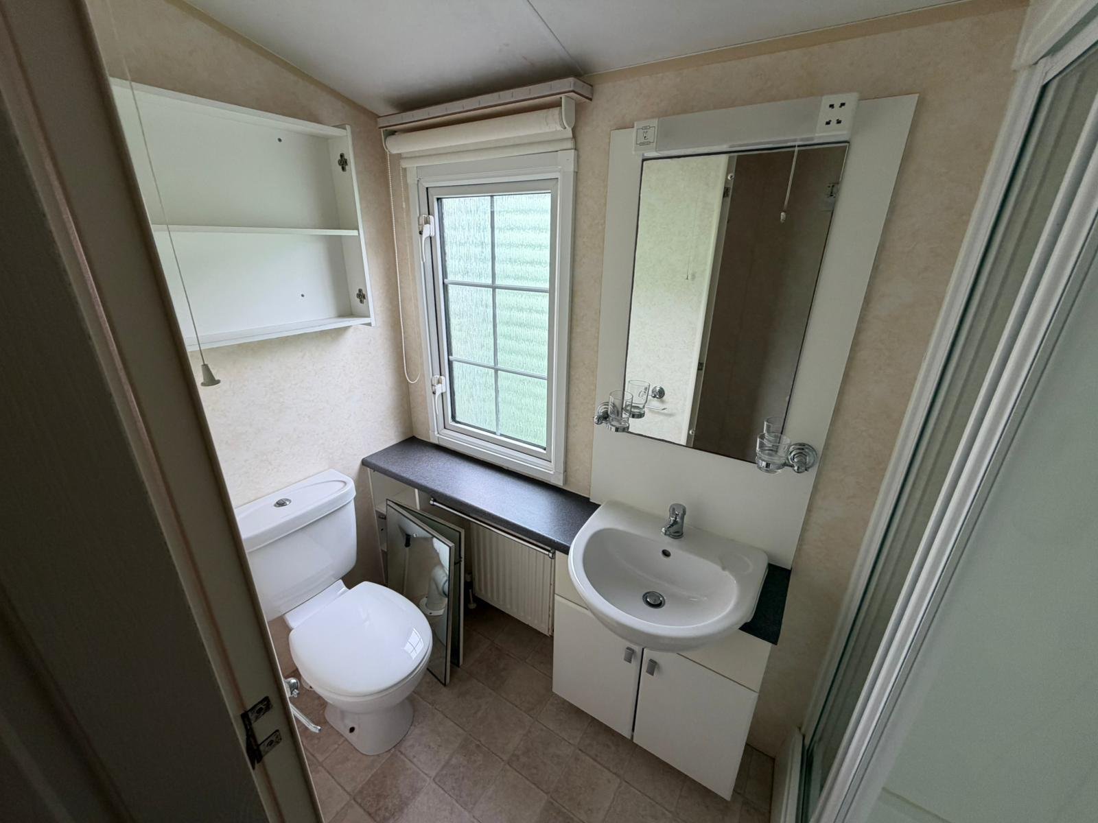 - Koupelna s velkým sprchovým koutem, umyvadlem a WC